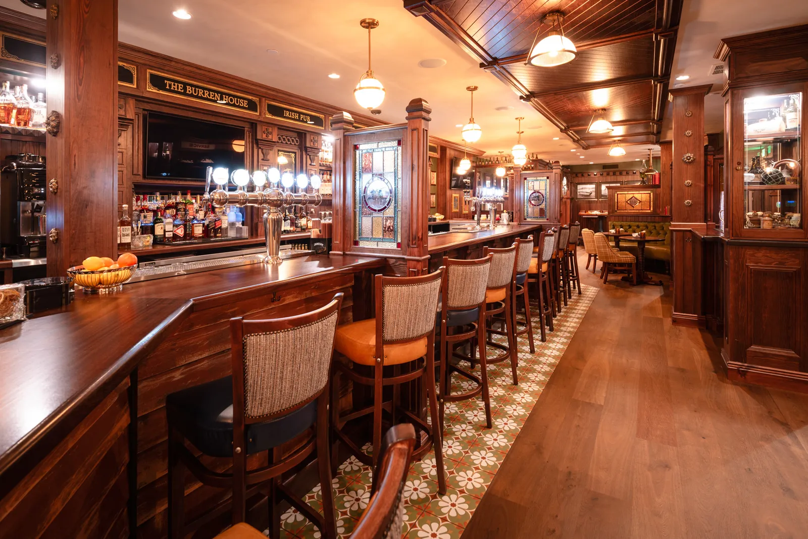 When Hynes talks of the pub “coming together,” he means the assembly of the component pieces—the mahogany bar and millwork for the backbar counters and shelving, leather stools and chairs, decorative floor tiling, mirrors and glasswork and knickknacks. Each element was designed and produced in Ireland, then sent over in a shipping container. The Liscannor stone in the entryway was sourced in the Burren region, the bar’s namesake. Noticeably absent are shamrock garlands, green tinsel and leprechaun-themed anything.