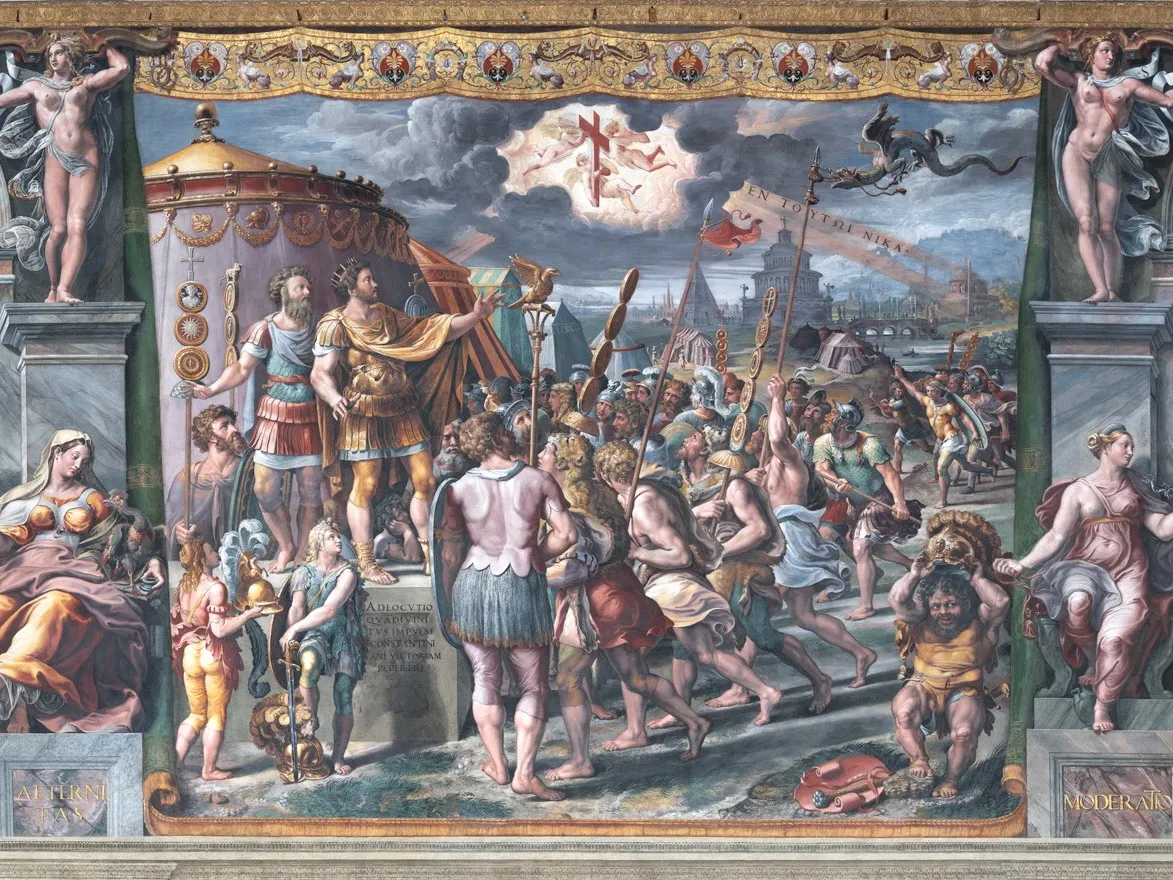 Raphael envisioned his design as a series of murals depicting the triumph of Christianity over paganism: The Vision of the Cross, The Battle of the Milvian Bridge, The Baptism of Constantine and The Donation of Rome. The hall is “the most politically and programmatically important room in the complex,” Jatta explained at a recent press conference, per the Catholic News Agency’s Victoria Cardiel.