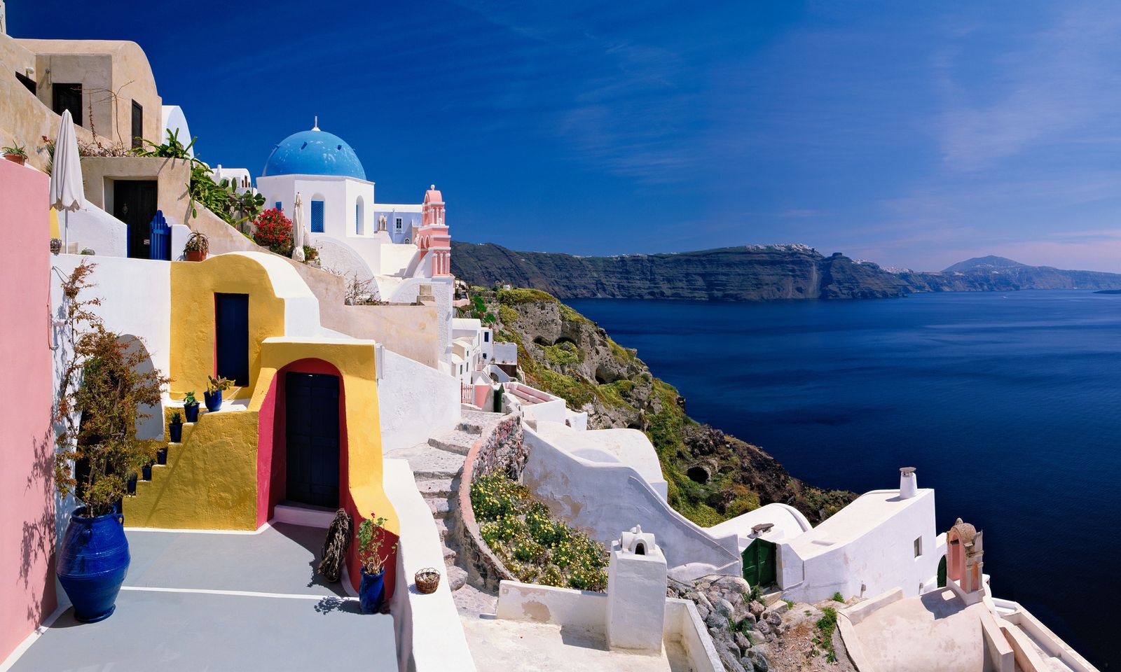 Brightly colored homes line the caldera in Santorini, a contrast to much of the blue-and-white motif.
