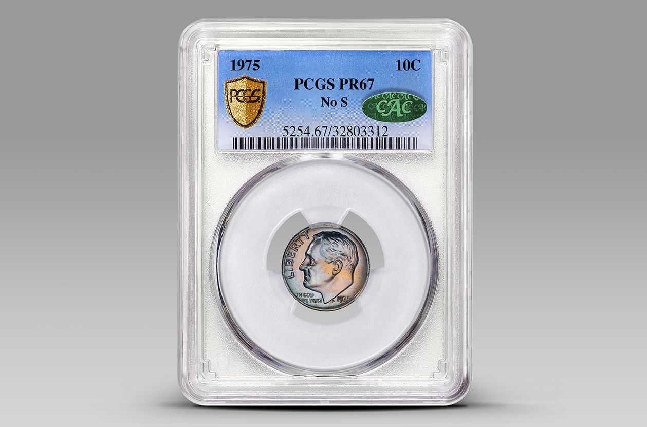 In 1975, the San Francisco Mint produced a “proof” set of more than 2.8 million coins. Three years later, collectors discovered that two of the dimes in that set were missing the “S” mark, making them a “modern rarity,” according to the lot listing.