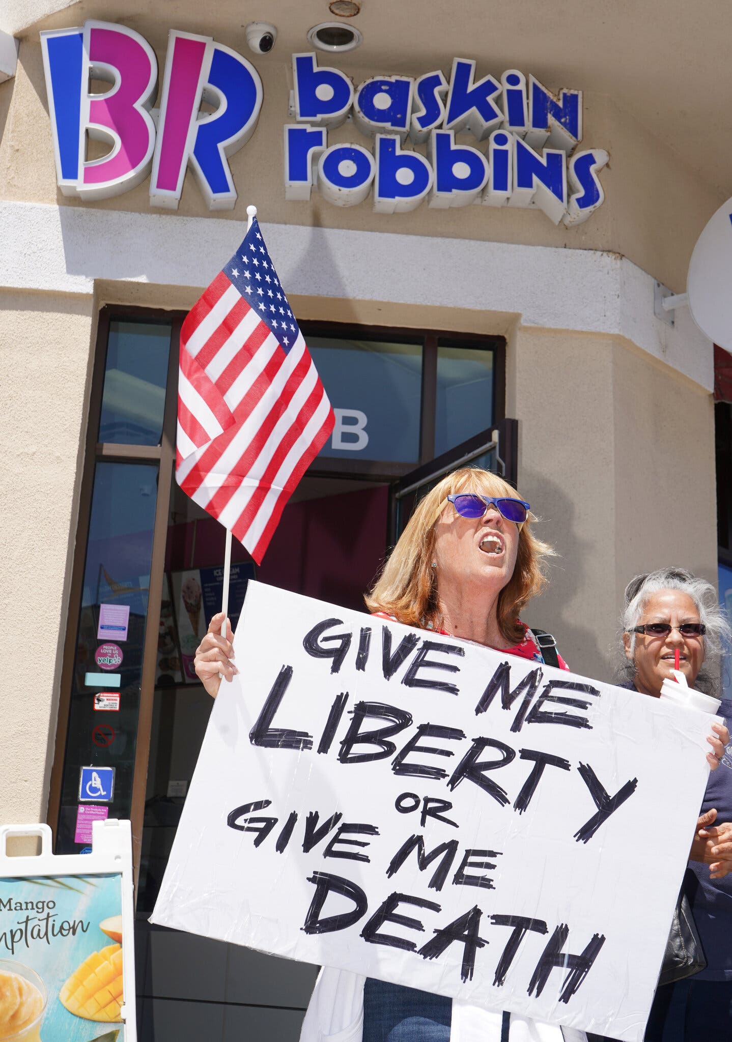A woman holds a poster featuring Henry's famous phrase at a May 2020 demonstration protesting the continued closure of businesses due to the Covid-19 pandemic. Mark Makela / Getty Images