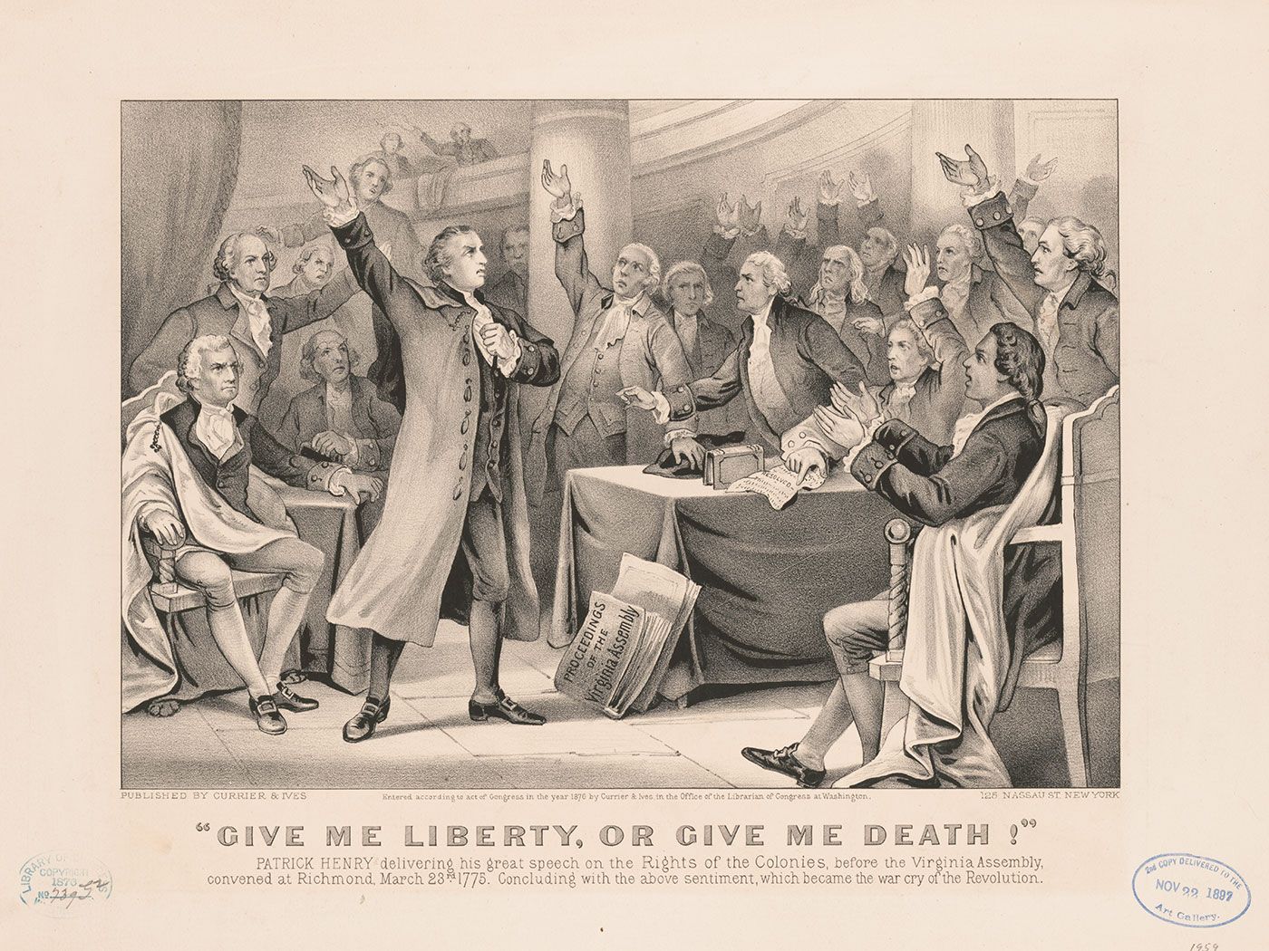 A 19th-century lithograph of Patrick Henry's "give me liberty or give me death" speech Library of Congress Prints and Photographs Division