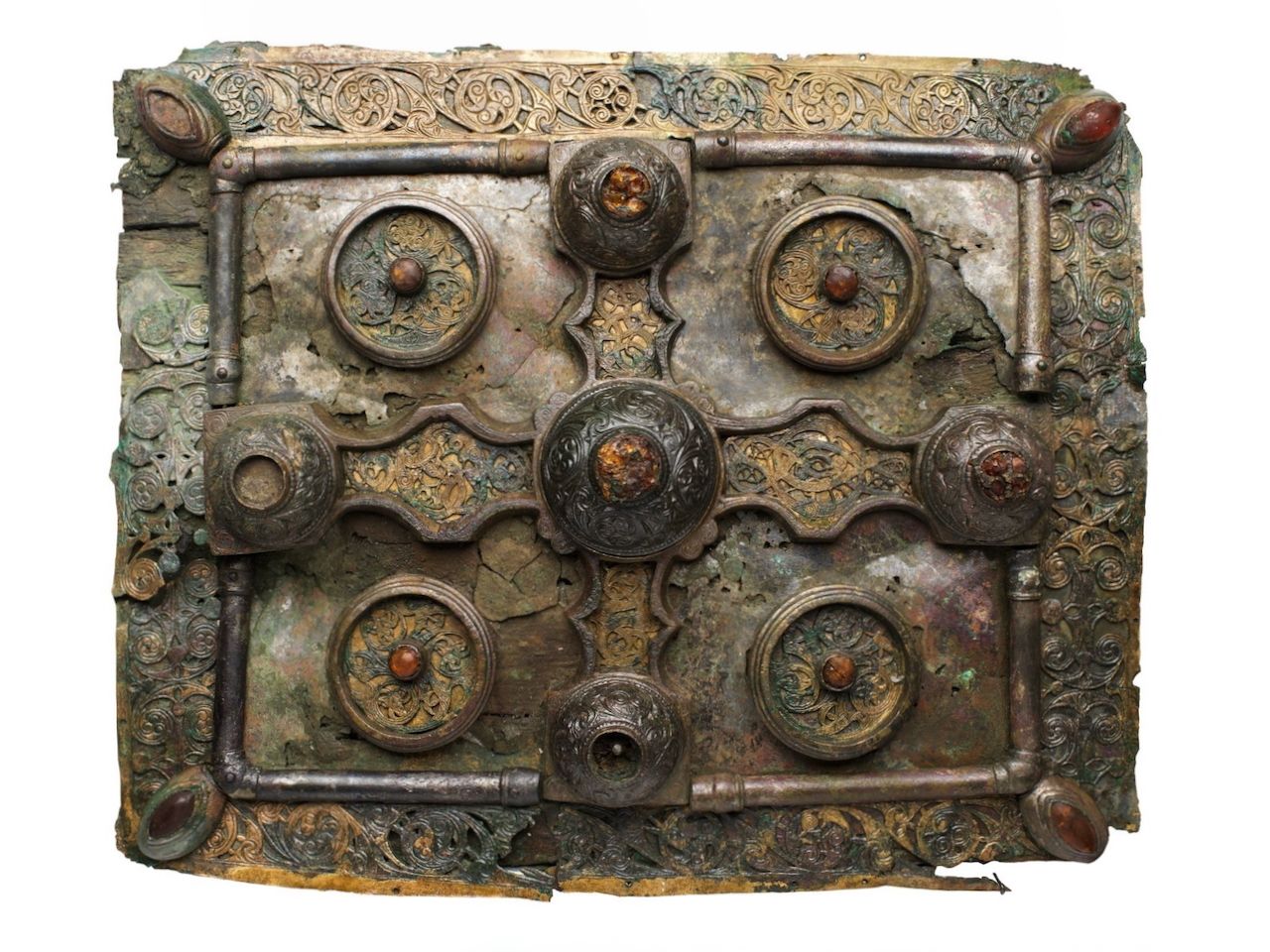 The shrine is about the size of a telephone book, Mullarkey adds. Made of an oak box and bronze plates, it’s decorated with a large cross, studs, medallions and engraved patterns. Its snake head-shaped hinges once held a thick leather strap. After the shrine emerged in pieces from the lake, it was displayed for six months in a tank of water before conservators began the decades-long preservation process.